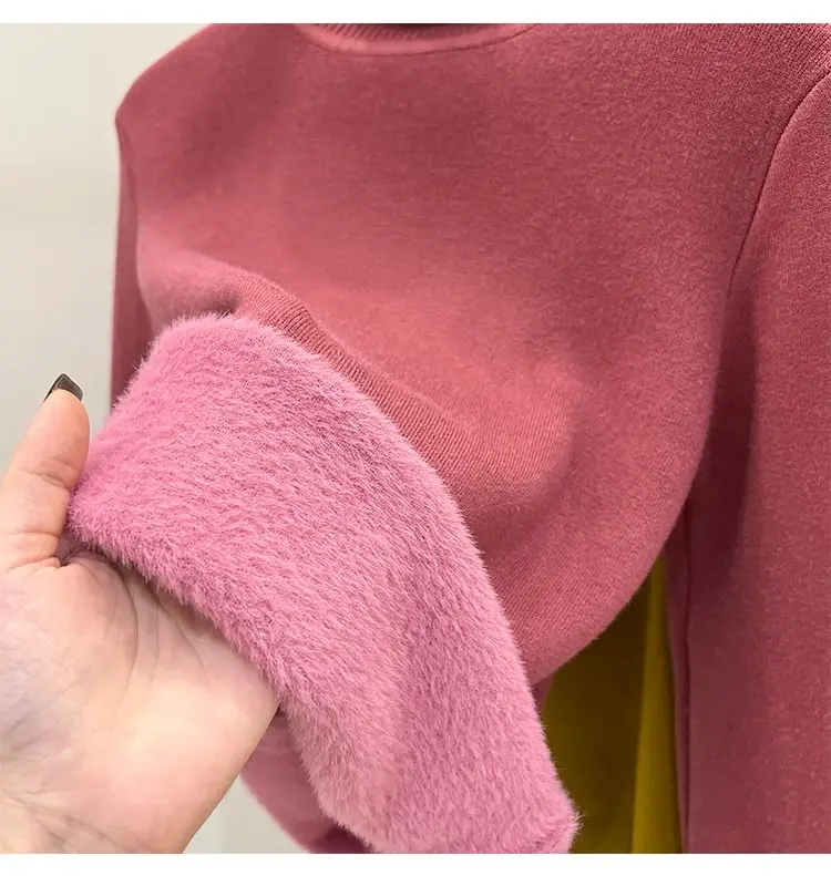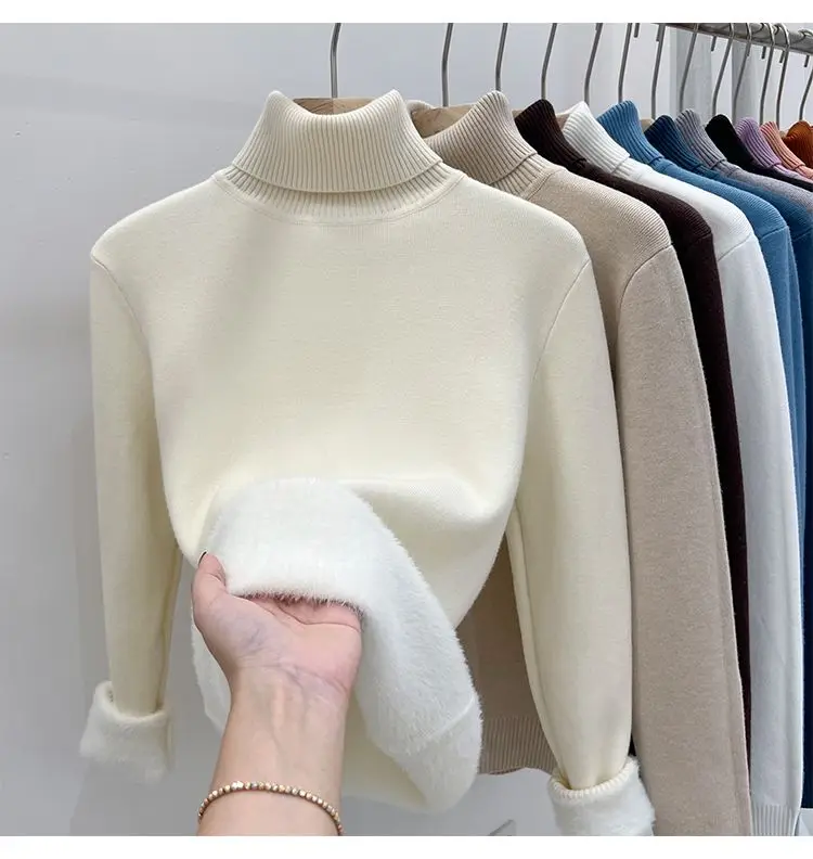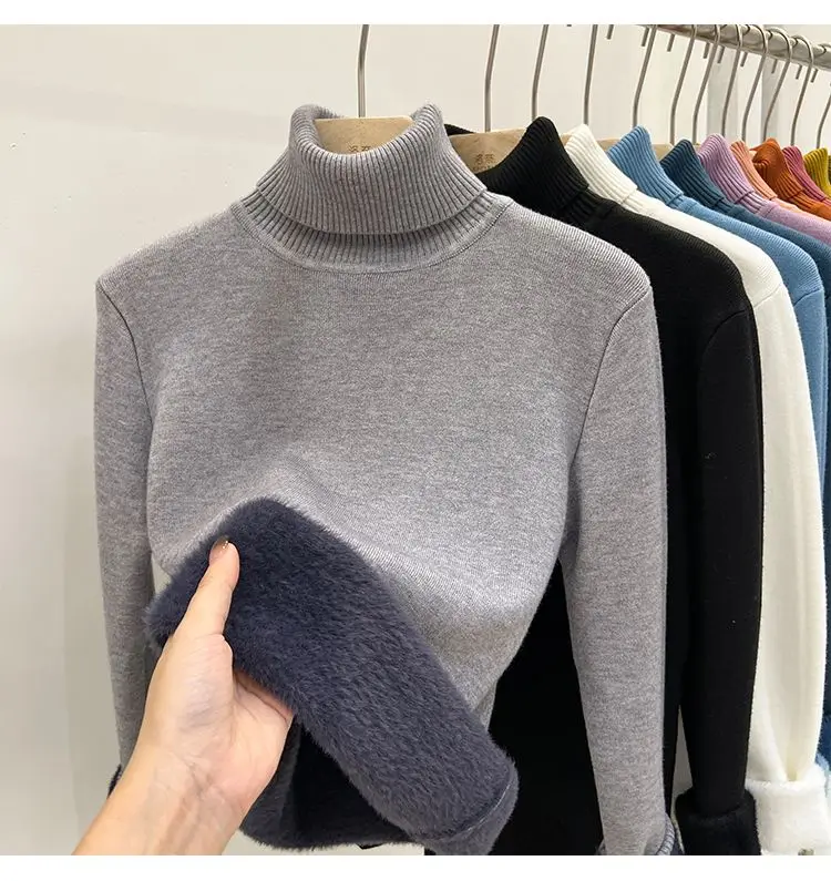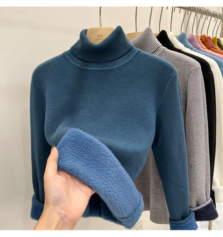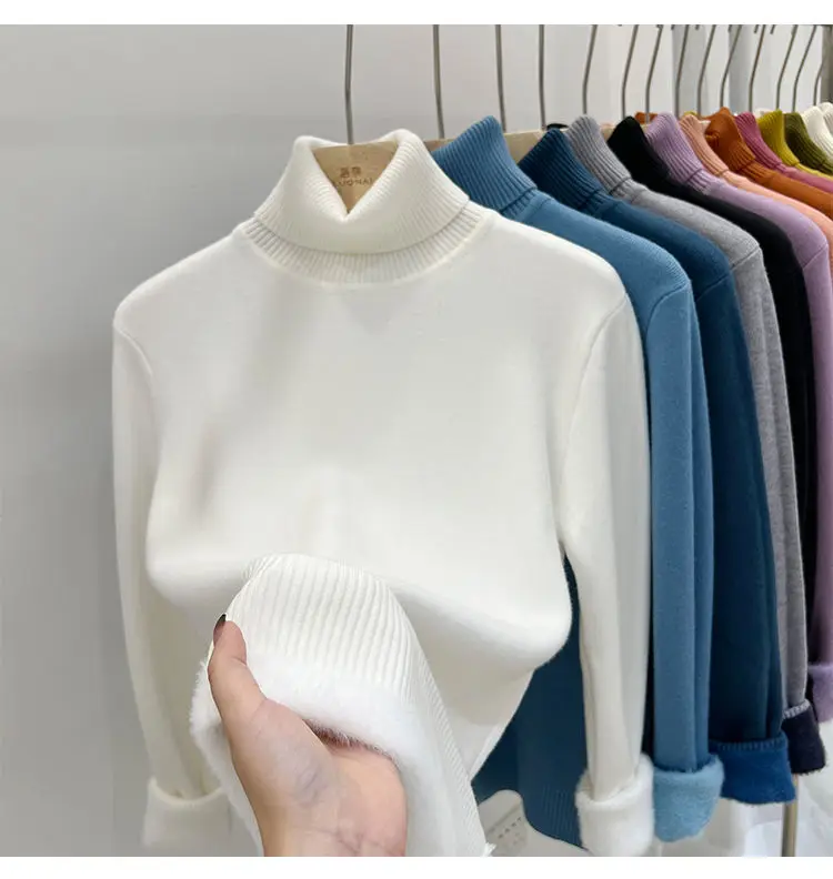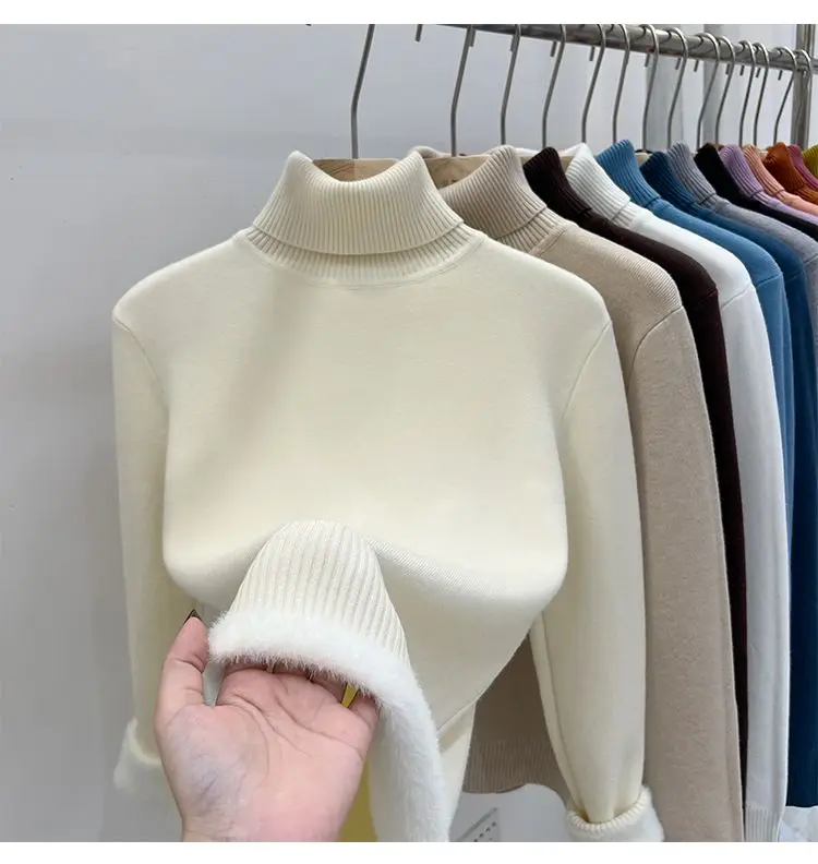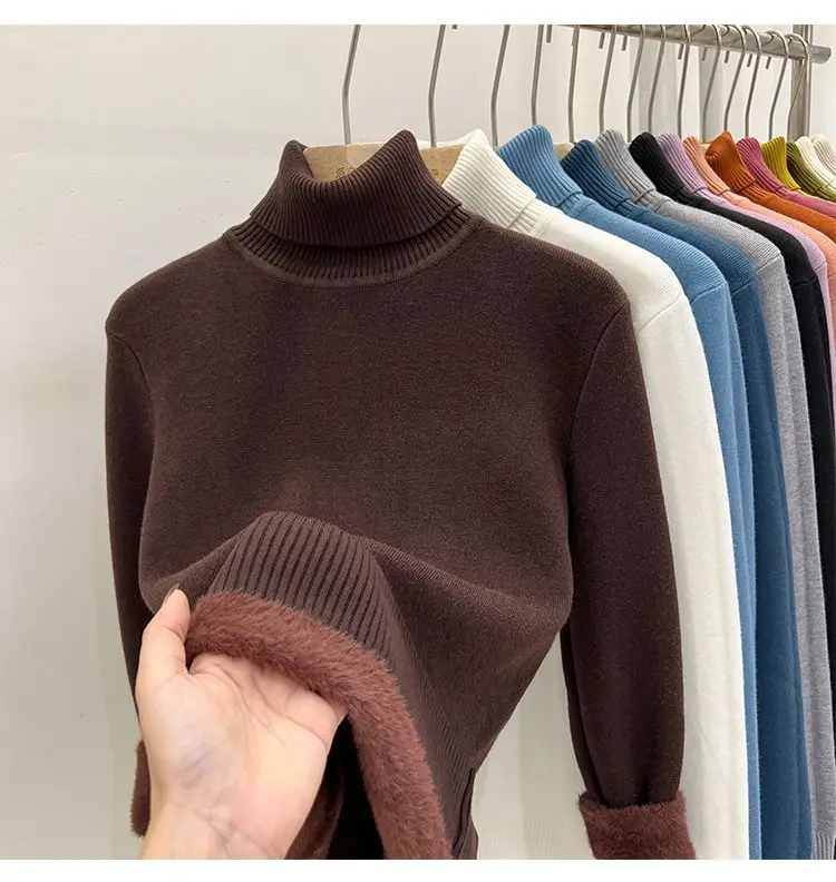 2024 Turtleneck Winter Sweater Women Elegant Thicken Velvet Lined Warm Sueter Knitted Pullover Slim Tops Jersey Knitwear Jumper